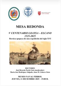 Organizada por la Asociación de Historia y Cultura Militar Noroeste, con la colaboración del Museo Naval de Ferrol y el Instituto de Estudios Coruñeses José Cornide, el 11 de diciembre de 2025 tuvo lugar, en la sede del Museo Naval de Ferrol, la mesa redonda “V Centenario Loaysa-Elcano 1525-2025. Heroica epopeya de una expedición del siglo XVI”.