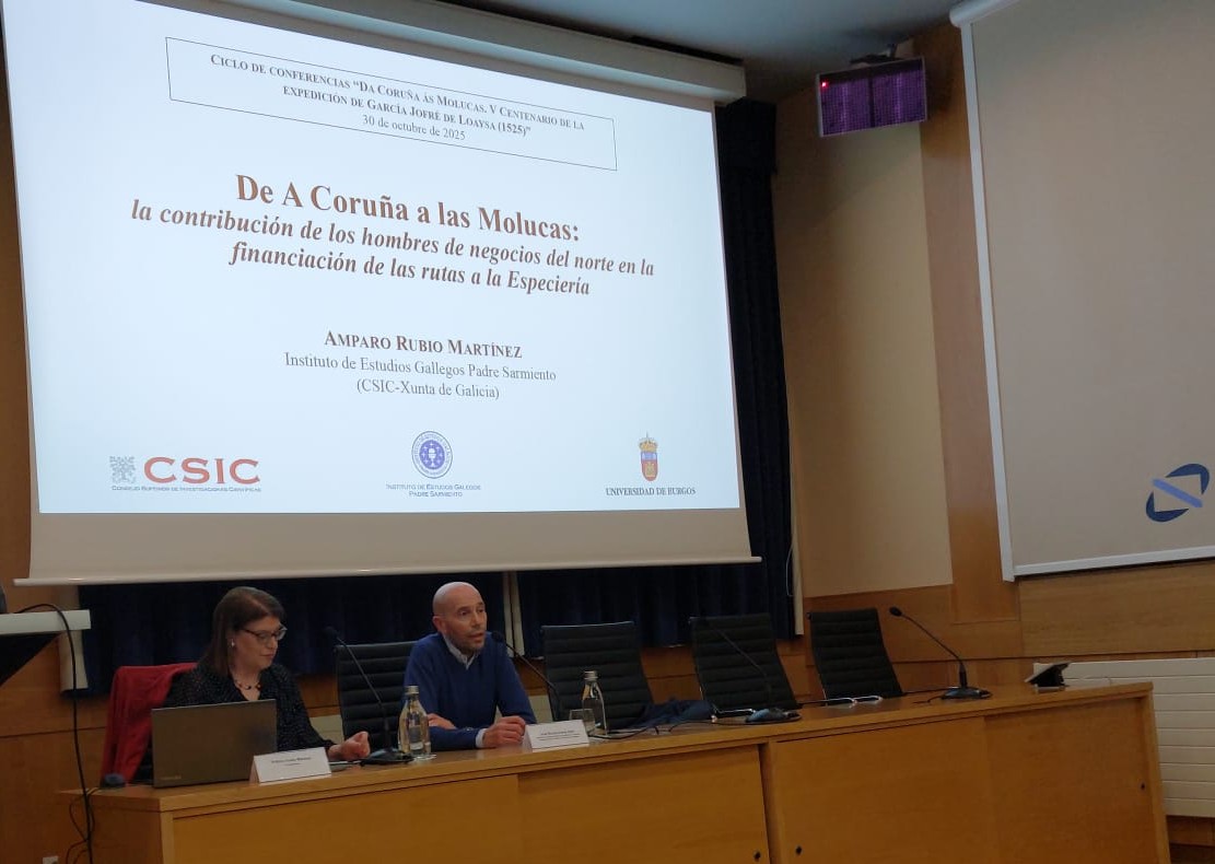De entre las intervenciones que conforman el ciclo conferencias “Da Coruña ás Molucas. V Centenario da Expedición de García Jofré de Loaysa (1525)”, organizadas por el Instituto José Cornide de Estudios Coruñeses (Ayuntamiento de A Coruña) y coordinadas por José Ricardo Pardo Gato, el 30 de octubre de 2025, en el salón de actos de la Autoridad Portuaria de A Coruña, tuvo lugar la conferencia de la Científica Titular del Centro Superior de Investigaciones Científicas (CSIC), Amparo Rubio Martínez. La conferencia llevó por título “De A Coruña a las Molucas: la contribución de los hombres de negocios del norte en la financiación de las rutas a la Especiería” y la ponente fue presentada por el propio Pardo Gato.