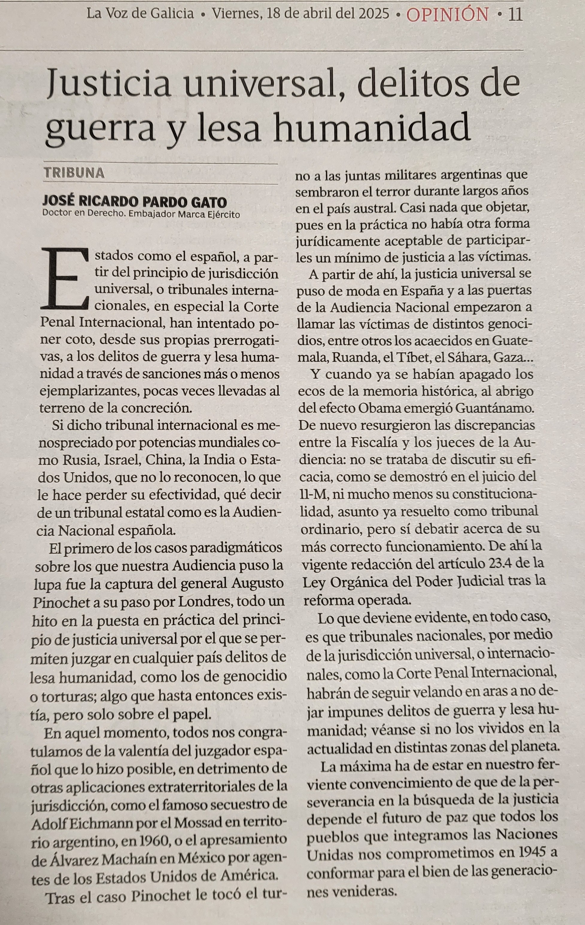 El diario “La Voz de Galicia” de 18 de abril de 2025, en su sección Tribuna, publica un artículo de opinión de José Ricardo Pardo Gato, en su condición de doctor en Derecho y embajador Marca Ejército, bajo el título “Justicia universal, delitos de guerra y lesa humanidad”. Se trata de una llamada a la coherencia en el mundo actual en el que vivimos, con enfrentamientos armados en prácticamente todos los continentes, y a la justicia que merecen las víctimas ante los delitos de guerra y lesa humanidad.